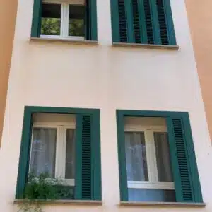 Puerta para trastero de aluminio abatible de 1 hoja en color embero con lamas de persianas en la parte superior y panel machihembrado vertical inferior.